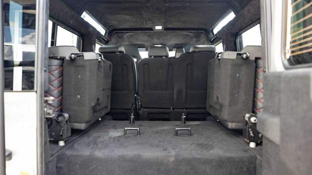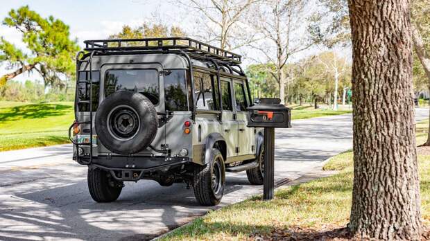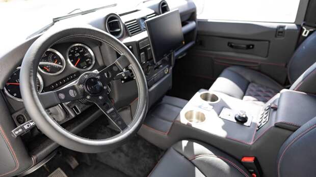 Окрашенный в зеленовато-серый цвет внедорожник получил 16-дюймовые колеса Wolf Steel матово-чёрного цвета, которые дополнены аксессуарами аналогичного оттенка. В салоне появились сиденья Corbeau Trailcat, обшитые чёрной кожей с красной прострочкой, а в багажнике размещены два складных кресла — электрический Defender 110 рассчитан на семь человек.