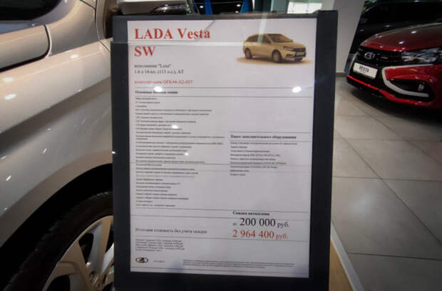 Это стоимость без учета скидки автосалона, которая может достигать 200 тысяч рублей. Во столько продавец оценил универсал Lada Vesta SW в комплектации Luxe, с 1,6-литровым мотором мощностью 113 лошадиных сил и вариатором. Причем это не самая дорогая версия – вместо планшета мультимедийной системы у нее обычный интегрированный экран.Ранее на онлайн-площадке Drom.ru модель в аналогичной комплектации и с тем же мотором продавали за 2,2-2,5 миллиона рублей.
