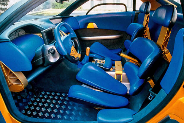 Внутри — кожа и алюминий, а цветовая гамма могла запросто вызвать психическое расстройство у неуравновешенного водителя: все детали выкрасили в ярко-желтый и ярко-синий цвета. На сиденья, состоящие из пяти отдельных частей, без раздумий могли водрузиться лишь отъявленные смельчаки. Приборную панель с длинным и узким жидкокристаллическим табло дополнял экран навигационной системы Magneti Marelli.