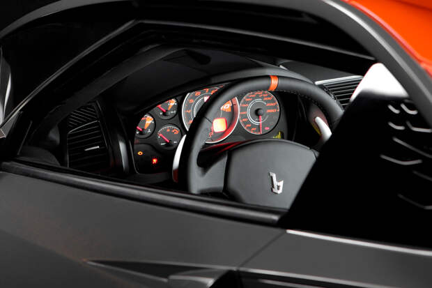 Главная стилистическая «фишка» машины — это, конечно, передние крылья, открывающие очаровательный клювик а-ля спойлер болида Формулы-1. Автомобиль создан двухместным, а пассажирское сиденье было смещено назад относительно водительского, чтобы локтями не толкаться.