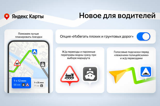 «Яндекс Карты» получили очередное обновление: теперь приложение может предупреждать автомобилистов о железнодорожных переездах, паромных переправах и «лежачих полицейских». Но что еще важнее, из маршрута отныне можно исключить плохие дороги, проезд по которым может быть затруднителен. Кроме того, были внедрены новые голосовые уведомления, предупреждающие о препятствие на пути.