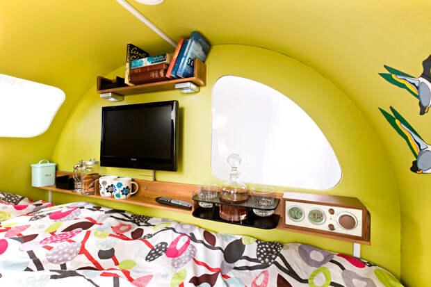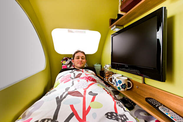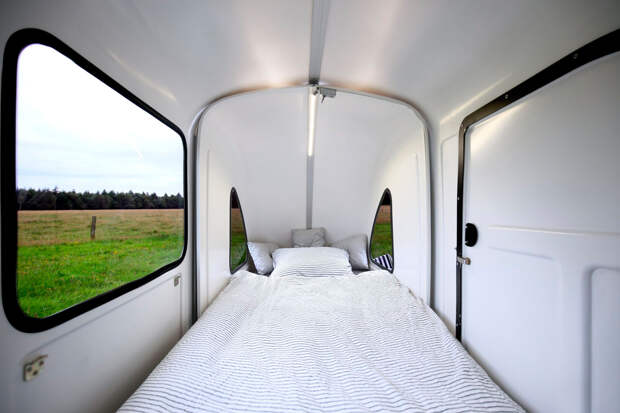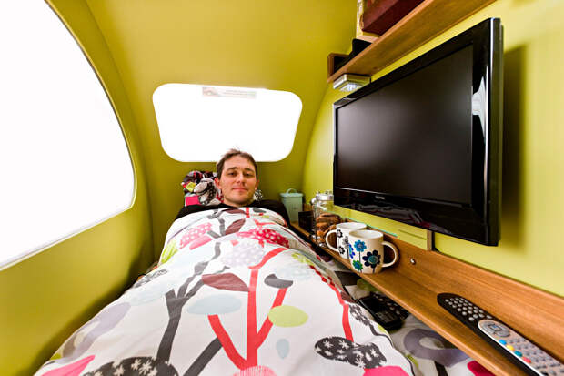 Из минусов: этот дом одноместный — иначе при длине два метра и ширине 75 сантиметров никак не получается. Из плюсов: внутрь влезает даже 19-дюймовый телевизор, магнитола, книжная полка и розетка для чайника, а доехав до кемпинга и отсоединив дом, вы сохраните мобильность за счет имеющегося велосипеда.