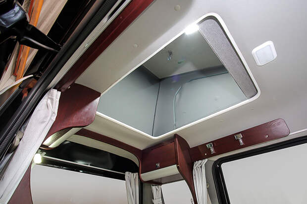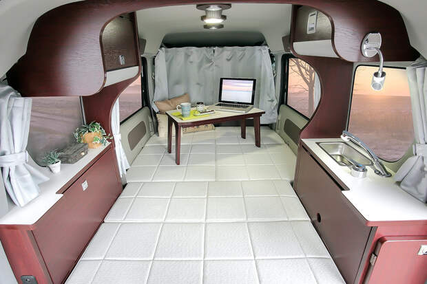 Зато по росту у спящих практически никаких ограничений, можно растянутся на 1.92 метра, а в остальное время салон превращается в уютную гостиную со столом и даже мини-кухней с раковиной. При желании лейка из раковины перевешивается в багажник, превращаясь в мини-душ.