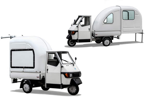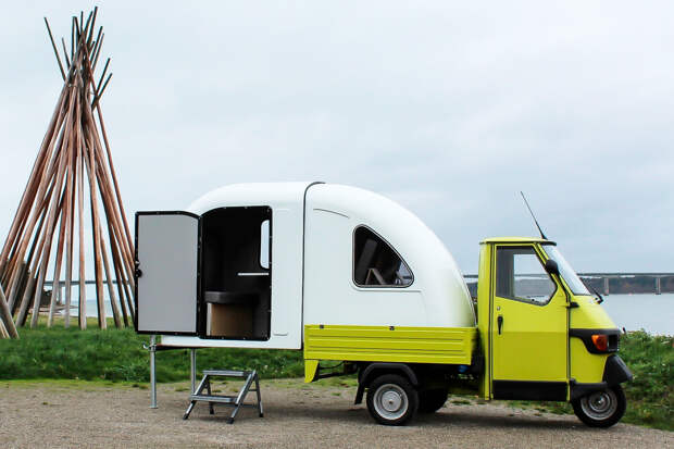 И все-таки датской фирме Wide Path удалось пробить рамки невозможного и создать на базе Piaggio автодом, который по площади даже больше, чем сам грузовичок. Для этого на грузовую платформу трехколески установили оригинальный раздвижной домик «ракушку».