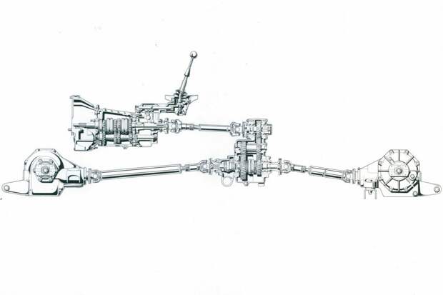 Трансмиссию можно сравнить разве что с Nissan GT-R: пятиступенчатая коробка передач располагалась в блоке с двигателем, а вот «раздатка» была выполнена заодно с задним редуктором — от него к передней оси шёл длинный кардан. Кстати, задняя передача была установлена в раздаточной коробке — что в результате давало пять скоростей вперёд и пять назад.