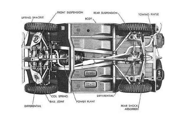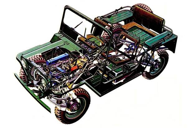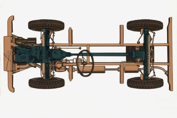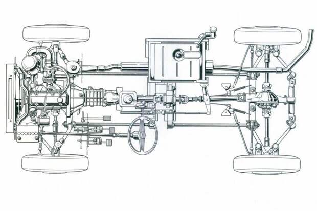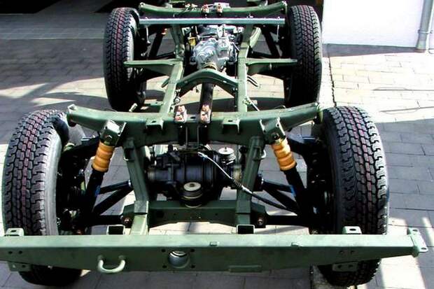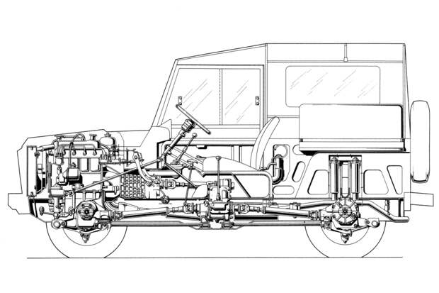 Конструкция всех армейских «джипов» кажется почти одинаковой — словно их делали по одному рецепту, популяризированному фирмой Willys во Вторую мировую. В этом смысле Willys, классический Land Rover, наш УАЗ и «Гелендеваген» — одного поля ягоды: прочная лонжеронная рама, мосты спереди и сзади, простенький железный кузов с брезентовым верхом.
