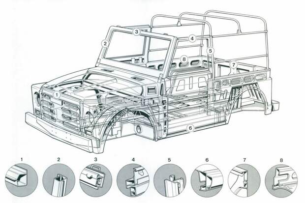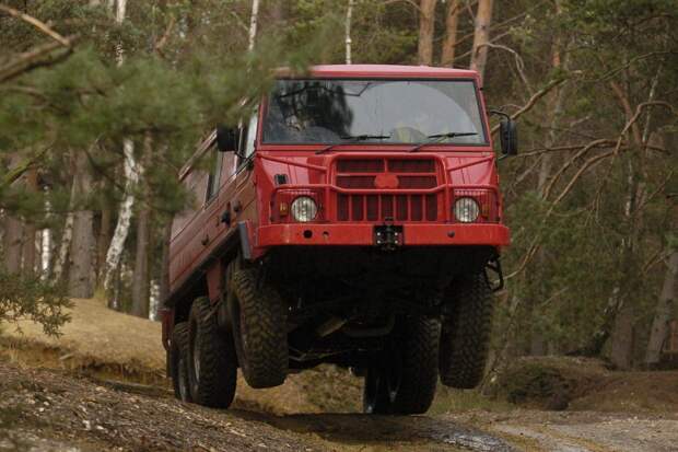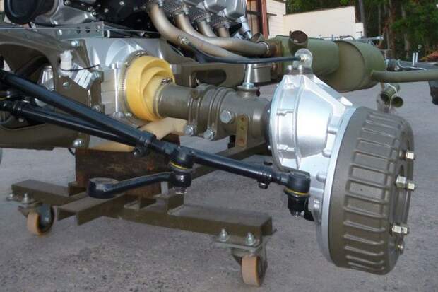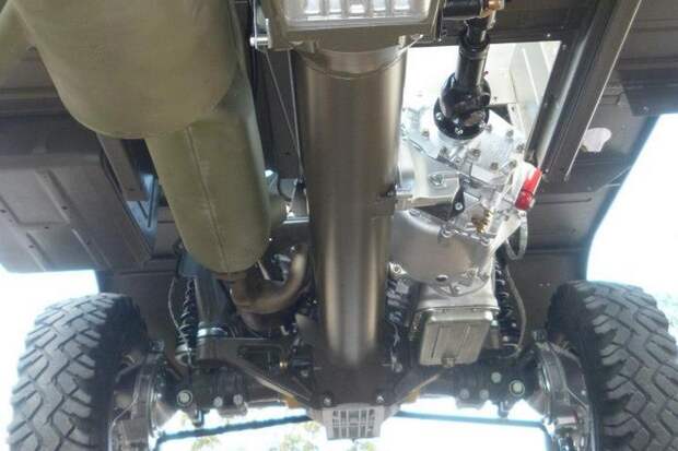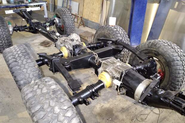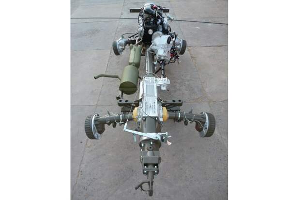 Примечательно, что с самого начала конструкторы предусмотрели несколько вариантов длины и даже трёхосную версию! Возможности трансмиссии широчайшие: передняя ось с жёстким подключением плюс принудительная блокировка всех межколёсных дифференциалов.