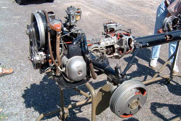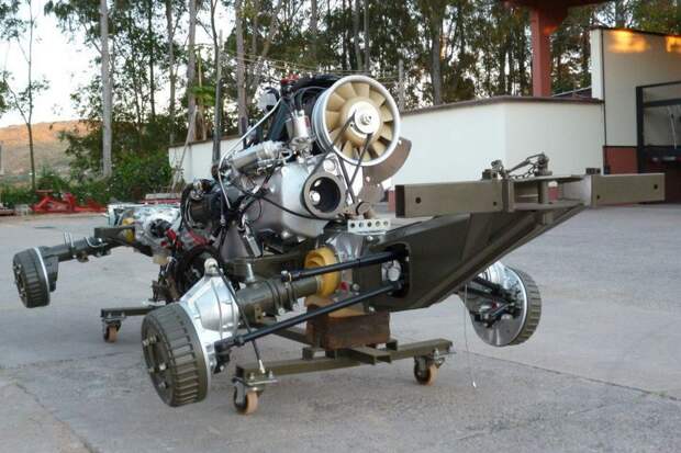 Пожалуй, примитивная рама из прямых лонжеронов — единственное в конструкции, что можно назвать традиционным. Кузов изготовлен из алюминия, двигатель — V4 1.8 воздушного охлаждения, подвеска всех колёс — независимая, на продольных рычагах и четвертьэллиптических рессорах, а барабанные тормоза вынесены из колёс и размещены на корпусах редукторов.