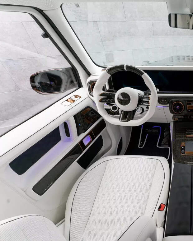 Салон полностью перешит мягкой белой кожей с черной контрастной прострочкой. Разумеется, и здесь нашлось место для вставок из карбона.