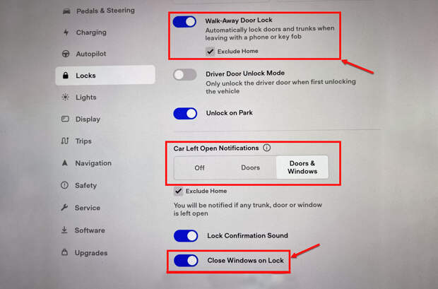 Настройки Tesla позволяют задать несколько сценариев блокировки окон и дверей, однако погодные условия в них пока не предусмотрены. Первый сценарий называется «Walk-Away Door Lock» и его можно активировать в разделе настройки замков — в этом случае, когда водитель покинет салон автомобиля со смартфоном или брелоком, двери и багажник автоматически закроются. Там же можно активировать функцию «Close Windows on Lock», то есть автоматическое закрытие окон. Также предусмотрена возможность отправки уведомления на телефон о незакрытых окнах и незапертых замках.