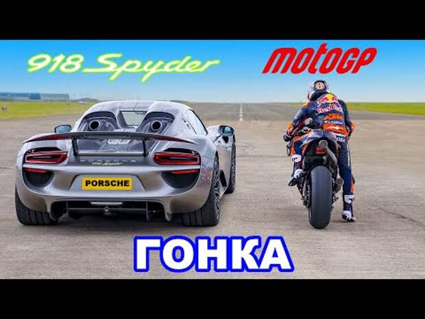 #carwow #porsche #ktm #motogp Понравилось видео? Подписывайтесь на @carwow Русская версия и включайте уведомления, чтобы не пропускать новые выпуски! Представляем топовый драг-заезд автомобиля и мотоцикла - Porsche 918 Spyder против супербайка Red Bull MotoGP!! Всё верно, нам удалось заполучить 918 Spyder, и он посостязается в заезде на 402 м с легендой MotoGP Дани Педросой на мотоцикле Red Bull KTM RC16 сезона MotoGP 2021 года! Давайте сравним характеристики - и начнём с Porsche: он оснащён 4,6-литровым атмосферным V8 и вспомогательными электромоторами, совокупная мощность 887 л.с. и 1280 Нм момента! Авто полноприводное, его снаряжённая масса 1674 кг. Но, разумеется, супербайк куда легче - водитель и сам мотоцикл вместе весят всего 200 кг! А двигатель байка объёмом 1000cc выдаёт 270 л.с. Так как вы считаете, станет ли заезд лёгкой победой для супербайка? Или будет фотофиниш? Есть лишь один способ выяснить - ПОГНАЛИ! Carwow Shorts - https://www.youtube.com/channel/UChqjw1OxDLUVvoP3r7BXteg TikTok - https://vm.tiktok.com/Vr2AS9/ Instagram - http://www.instagram.com/carwow Instagram Мэта - http://www.instagram.com/matwatsoncars Facebook - http://www.facebook.com/carwowuk/ Twitter - http://www.twitter.com/carwowuk e-mail - reviewmycar@carwow.co.uk Канал Мэта - https://www.youtube.com/channel/UCulu1KUYJ_2OBDouc_d-cUA Оригинальное видео от 9.07.2022 Ссылка: Мерч: https://teespring.com/en-GB/stores/carwow-index