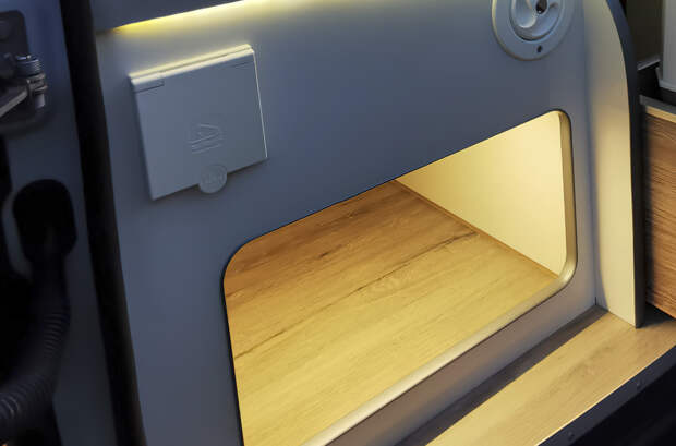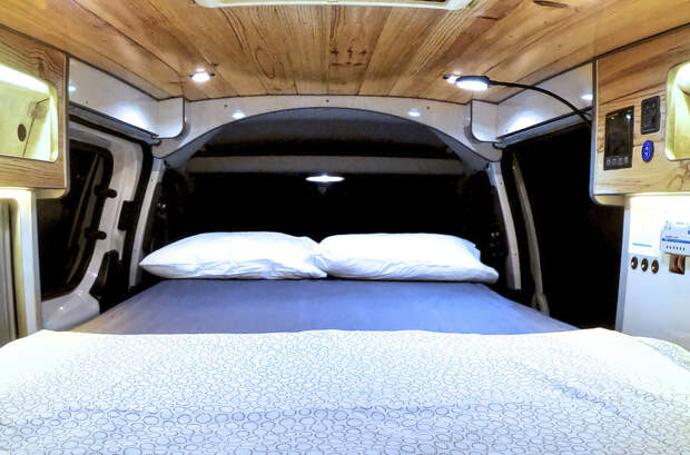 В жилом модуле фургона тюнеры установили двуспальную кровать, модульную кухню, оборудованную электрической плитой, компактным холодильником и умывальником с 30-литровым баком с водой.