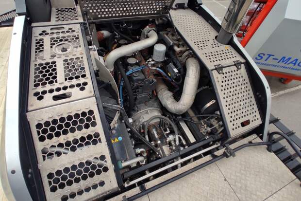Все это дело приводит в движение установленный в базе двигатель Mercedes мощностью 530 л.с. Он позволяет машине развивать скорость до 22,5 км/ч, но главное — преодолевать подъемы крутизной до 100%!
