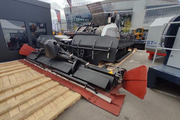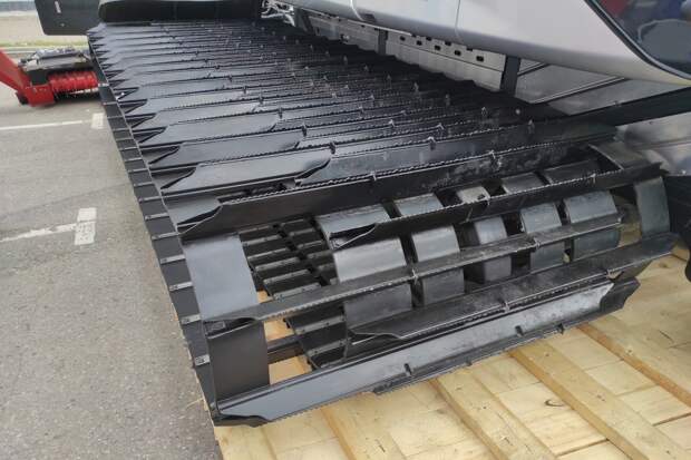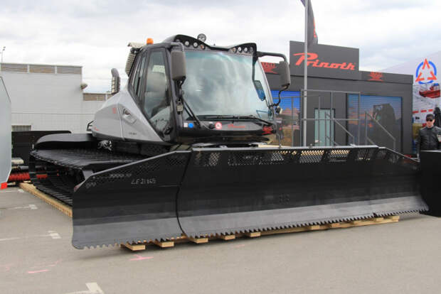 Среди разнообразных экскаваторов, погрузчиков и прочей дорожно-строительной техники этот аппарат выглядел необычно. Привычная среда обитания ратраков — это горы (например, лыжные курорты). И на асфальте выставочной парковки, да еще и на деревянном помосте, эта штуковина явно не чувствовала себя в своей тарелке.