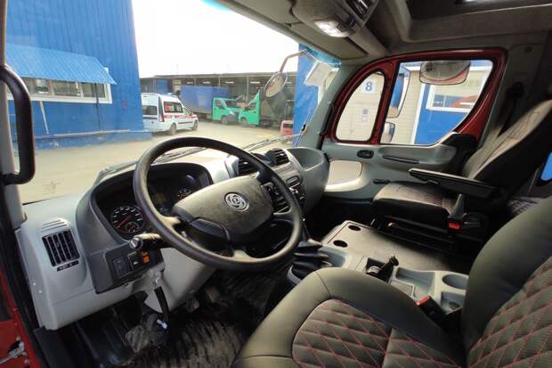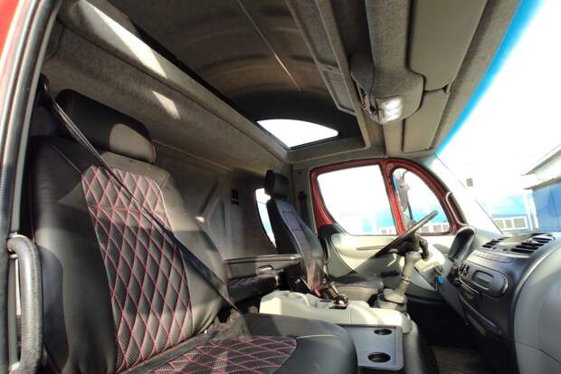 Тоненькая дверь в кабину с гипертрофированной пластмассовой ручкой — традиционная для азиатских грузовиков. Панель из убогого дешевого пластика — вся такая округлая, с претензией на дизайн. В пластиковых выемках для водителя и пассажира наблюдается симметрия — отличное решение для машины, которая продается и на «правосторонних», и на «левосторонних» рынках. А еще позабавили дефлекторы-ушки в центре: в сложенном положении они смотрят практически вверх и для регулировки как бы выдвигаются. Ну а что спальник?