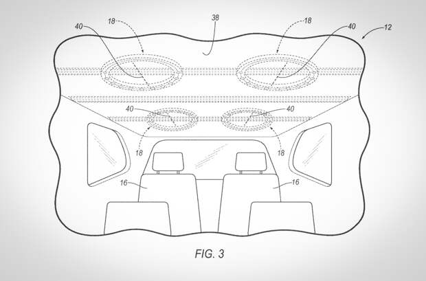 На патентные изображения надувных «коконов» безопасности обратил внимание портал CarBuzz.com. Судя по схемам, эйрбеги нового типа планировалось разместить на потолке беспилотника – всего таких подушек четыре, по одному на каждого пассажира.