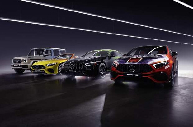 Основой арт-каров Mercedes-AMG и Palace Skateboards стали хэтчбек A 45 S, лифтбек GT 63 4Matic+, родстер SL 63 4Matic+ и внедорожник G 63. Все машины окрашены семислойной краской с градиентом, декорированы логотипами AMG и Palace. Для отделки салона использована кожа эксклюзивных расцветок и индивидуально оформленные напольные коврики, плюс на подголовниках и подлокотниках сделаны тиснения в виде двойных эмблем.