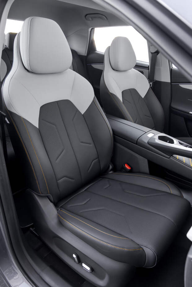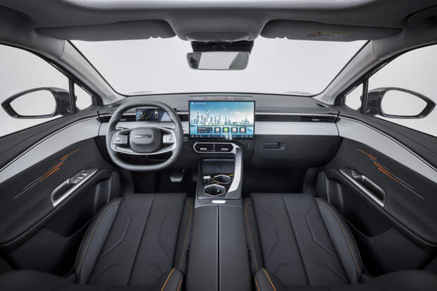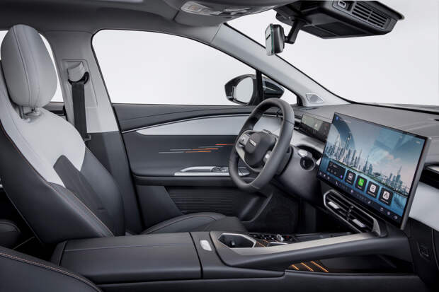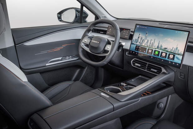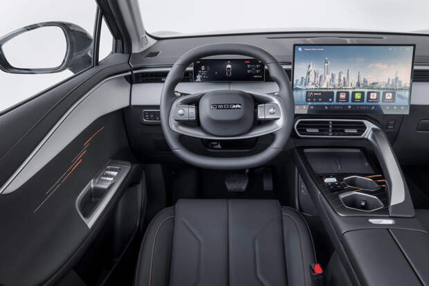 Внутри — уменьшенная копия Omoda C7. Передняя панель асимметричная, двухэтажная, что создаёт ощущение, будто водитель находится в отдельном кокпите. Материалы: мягкий фактурный пластик на верхней части торпедо, кожа (пусть и искусственная) на сиденьях и дверных картах в версиях «Драйв» и «Стиль». Сборка без нареканий, люфтов нет.