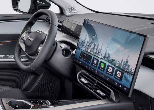 Мультимедийная система — одна из сильных сторон нового кроссовера. В версиях «Драйв» и «Стиль» стоит 15,6-дюймовый экран с разрешением 2К. В базовой «Актив» стоит экран на 12,3 дюйма, что тоже неплохо. За быстродействие отвечает 8-ядерный процессор Snapdragon 8155 с 16 ГБ оперативной памяти. Система готова к работе через 4 секунды после запуска, лагов и зависаний нет. Картинка плавная, сенсор отзывчивый.