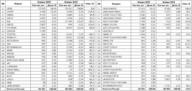 Топ-25 марок и моделей на рынке новых легковых автомобилей в январе 2023 года (шт.)