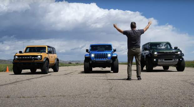 Американские полноприводники Ford Bronco и Jeep Wrangler чаще можно увидеть в заездах по пересечённой местности, чем в гонках по асфальту, но это не помешало журналистам с канала The Fast Lane Car свести две модели внедорожников от двух брендов в заездах по прямой. Причем цвета Ford отстаивали сразу две разных модификации — базовый Bronco и «заряженный» Bronco Raptor — в том время как за Jeep выступал один-единственный Wrangler Rubicon 392.