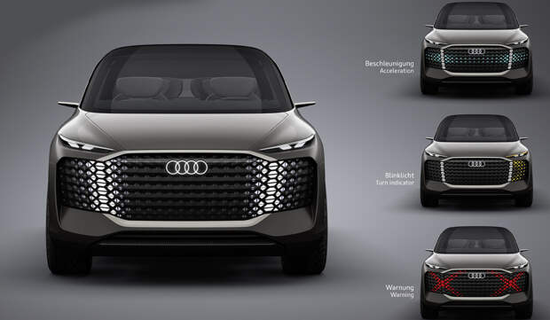 Отдельного внимания заслуживает передняя оптика. Светящейся сделана вся передняя секция: ячейки-пиксели могут зажигаться разными цветами и менять яркость, формируя рисунок «решетки радиатора», крупные сигналы поворота или предупреждающие знаки для пешеходов.