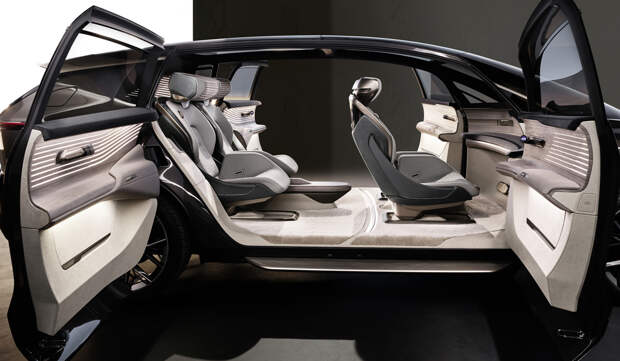 У задних пассажиров есть индивидуальные экраны медиасистемы, а также панорамный OLED-дисплей, который установлен на потолке и имеет прозрачную подложку. Управление — голосом или жестами. Динамики аудиосистемы встроены в том числе в подголовники, есть очки дополненной реальности (хранятся в дверных карманах). На дверях расположены компактные пульты с набором горячих кнопок и рукоятками регулировки температуры воздуха в салоне. А еще в комплект входят светящиеся зонтики Audi Light Umbrella.