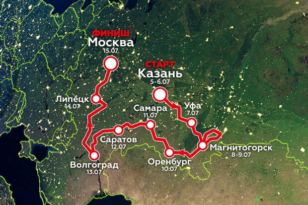Старт состоится на площади Тысячелетия в Казани, далее через Татарстан и Башкортостан караван достигнет Магнитогорска на восточном склоне Южного Урала. С Урала гонщики отправятся открывать степные и равнинные скоростные трассы Оренбургской, Самарской и Саратовской областей; заключительным испытанием станут пески Волгоградской области, а также бездорожье и броды Липецкой и Тульской областей. Финиширует ралли в Москве. В общей сложности протяженность гонки составит десять дней, за это время участникам предстоит преодолеть 5230 километров, 2350 из которых составят скоростные спецучастки, большинство из них — на смешанном покрытии.