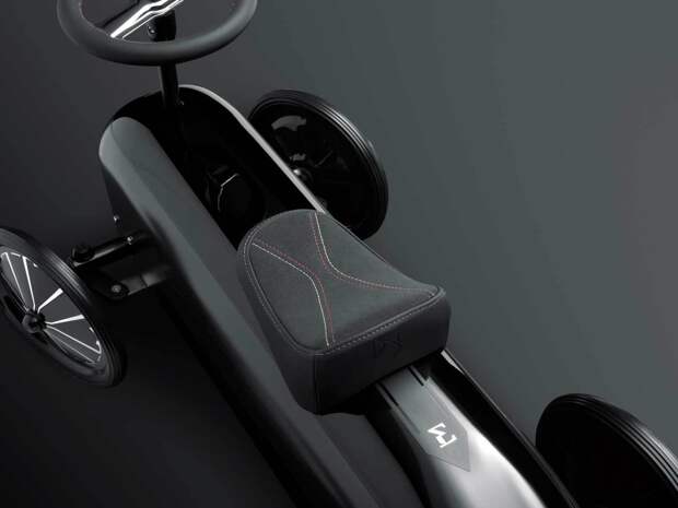 Ходунки сделаны в серо-чёрной гамме с такими же чёрно-серыми колёсами. В передней части появились световые модули, стилизованные под фирменный рисунок фар DS, а логотип марки украшает имя Лео. Сиденье обито алькантарой, а руль обшит кожей — всё как у настоящего кроссовера.