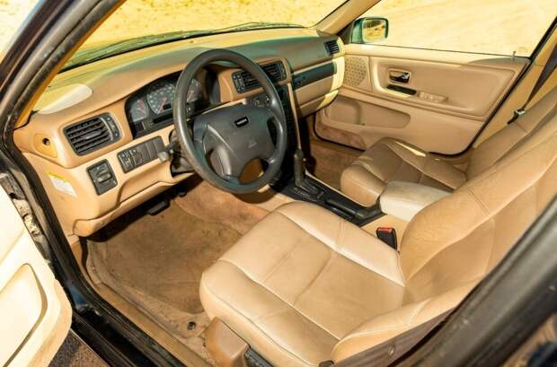 Салон Volvo обит бежевой натуральной кожей, которая в нескольких местах потрескалась. В оснащение входят электропривод водительского сиденья и всех окон, кондиционер и дисковый проигрыватель.