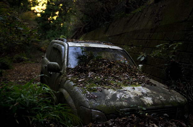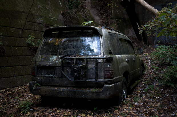 Автор блога предположил, что Land Cruiser Cygnus бросили под горой, чтобы скрыть следы преступления. Судя по описанию, автомобиль нарочно пригнали в тупик и поставили вплотную к бетонным плитам вблизи от деревьев. Перед машиной скопилось столько листьев, что их уровень почти достаёт до капота.