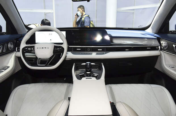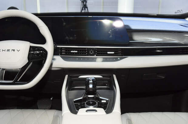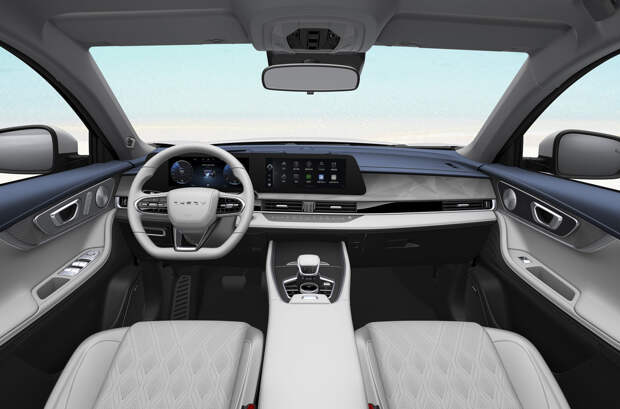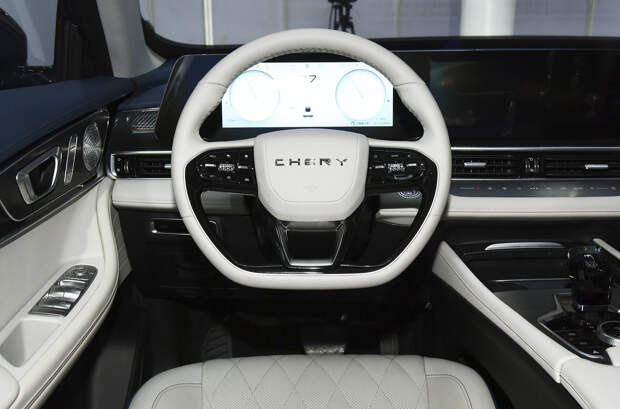 Внутри за основу взят салон Omoda 5, которая должна приехать в Россию: почти аналогично оформлены дверные карты и передняя панель с блоком из двух 12,3-дюймовых дисплеев. Также в оснащении — кресла с развитой боковой поддержкой и аудиосистема Sony.
