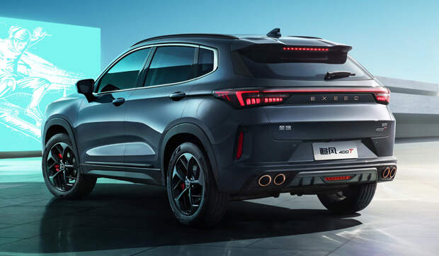 Рестайлинг принес кроссоверу Exeed LX новый передний бампер с безрамочной решеткой радиатора, измененную вставку в заднем бампере и оригинальные 19-дюймовые колеса. Особенности мощной топ-версии — четыре круглых патрубка выпускной системы и красная окраска тормозных суппортов.