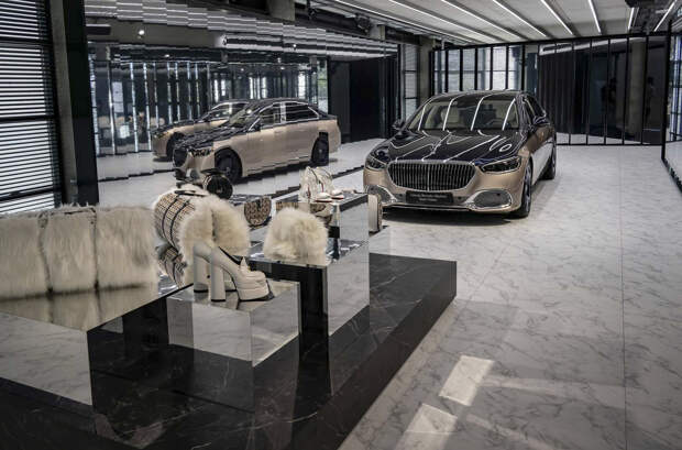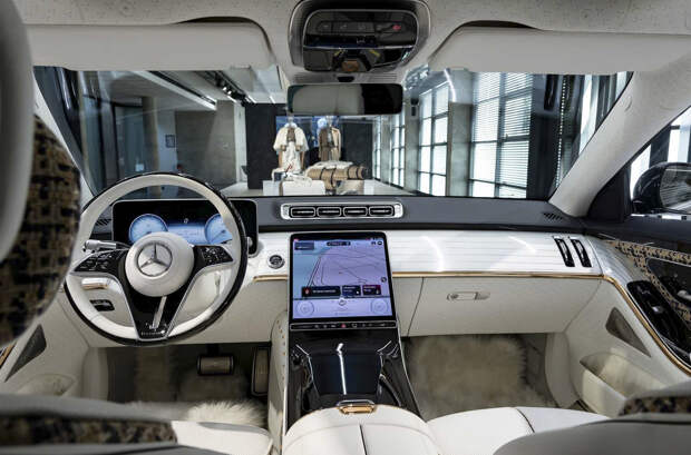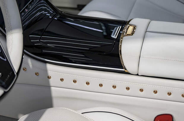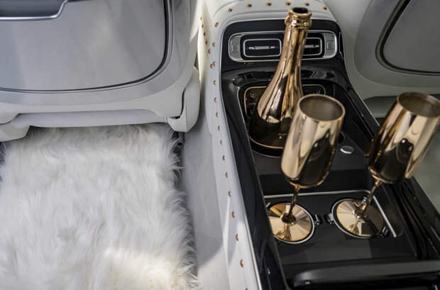 Экстравагантности декору добавляют акценты из розового золота и пушистый искусственный мех, примененный в дверных картах, подушках и даже ковриках — достанется ли такой непрактичный элемент лимитированной товарной версии, неясно. Также белым мехом отделаны сумки, идущие в комплекте с люксовым седаном.