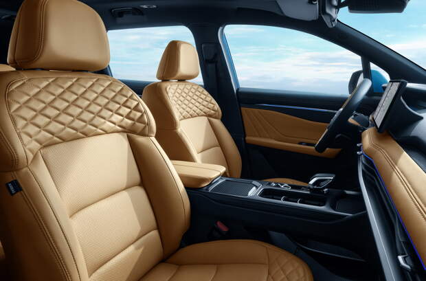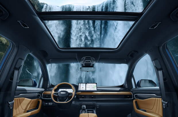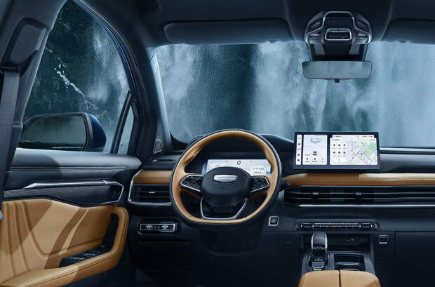 Интерьер новинки и вовсе показан впервые. Дизайнеры Geely избежали революции: у кроссовера сохранились цифровая приборная панель, отдельно стоящий 12,3-дюймовый тачскрин мультимедиасистемы и кнопочный пульт климат-контроля. Однако передняя панель, дверные карты и центральный тоннель видоизменены, изменился крой вентилируемых кресел.