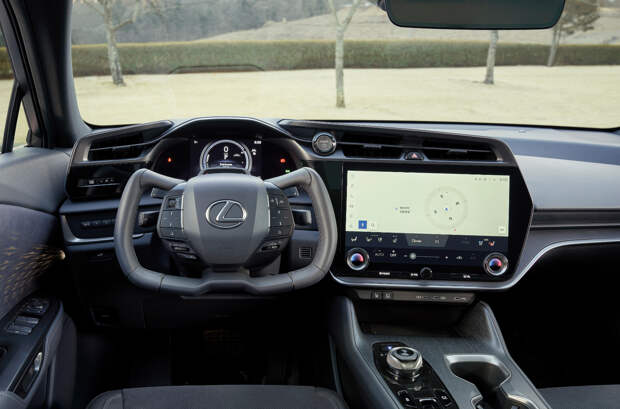 Для Lexus RZ заявлены рулевое управление «по проводам» (доступно опционально), два варианта руля — традиционное колесо либо штурвал, 14-дюймовый экран мультимедийной системы, панорамная крыша с функцией затемнения, проекционный дисплей, комплекс систем безопасности и электронных ассистентов.