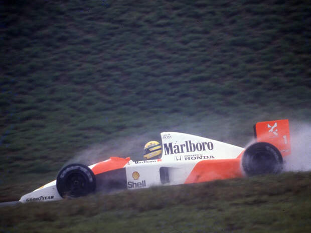 Но это была лишь иллюзия. «За семь кругов до финиша отказали третья и пятая передачи», — вспоминал Сенна. Единственной рабочей осталась шестая. Управлять McLaren MP4/6, оснащенным чисто механической коробкой, в таком состоянии на мокрой трассе было равносильно самоистязанию. На медленных поворотах обороты падали до двух тысяч, и V12 глох, на быстрых — без помощи торможения двигателем машину неудержимо выносило вперед. «Скажу вам, тормозить с 300 км/ч до 70 для первого поворота было непросто!» — признавался он после гонки.