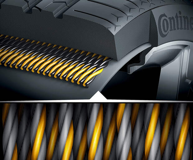 В протекторе шин Continental UltraContact используется особый слой из материала с усиленными полимерными связями — это обеспечивает необходимую прочность при наезде на препятствия