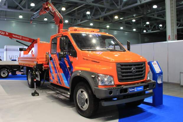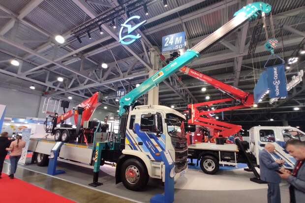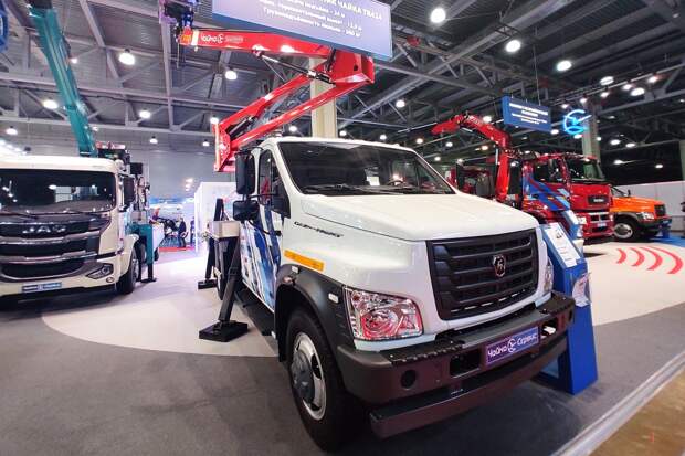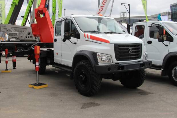 Была на выставке и техника компании Техинком. Вот, к примеру, автовышка MARS на шасси Газона Next с двухрядной кабиной (на фото — справа). Высота подъема здесь 23 метра, грузоподъемность до 300 кг, а максимальный вылет — 16,5 метра. Стоит такая машина 9,5 миллиона рублей.
