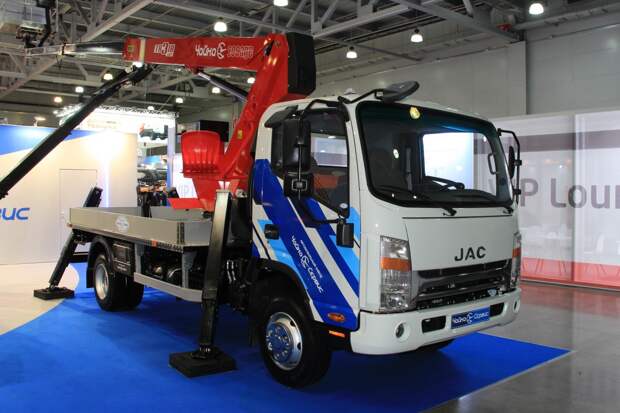 А вот — новинка: кран-манипуляторная установка HLC на основе бортового грузовика JAC N200. Про сам автомобиль мы подробно рассказывали в первой части обзора выставки, ну а что же до установки, то она рассчитана на нагрузку в 3,5 тонны на минимальном вылете и способна поднимать до 410 кг при максимальном вылете стрелы 19,6 м. Стоит такая машина 11 миллионов рублей.
