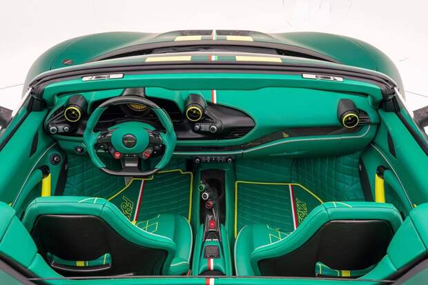 В тон кузову изменили и обивку салона суперкара. Все панели обшиты зелёной кожей с ярко-жёлтыми вставками и элементами из неокрашенного углепластика, на ковриках и подрулевых лепестках коробки передач появился итальянский триколор и в стиле же национального флага Италии оформили кнопки выбора ездовых режимов трансмиссии, которые развернули к водителю и установили на своеобразном подиуме.