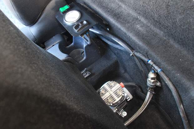 Ну в общем, теперь место для компрессора вроде бы определили окончательно — он снова оказался у задней стенки, но уже между сиденьями. Не сказать, что это самое удобное решение, ведь на ходу баллоны все равно не подкачаешь, — чтобы посмотреть на манометр, приходится разворачиваться.