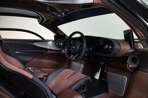 Гиперкар окрашен в перламутровый коричневый оттенок Rootbeer Brown, созданный самой Canepa, а затем воспроизведенный на заводе McLaren в Уокинге. Салон обит кожей и итальянским нубуком табачного цвета. Весь внешний декор и обвес по нижнему периметру кузова сделан из углепластика с мелким плетением.