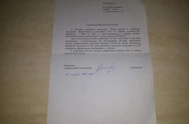 Текущий владелец «Чайки» приобрёл списанный автомобиль 1968 года выпуска в начале 2000-х. В процессе восстановления выяснилось, что первым владельцем был гараж 9-го управления КГБ при Совете Министров СССР, а в 1972 году седан передали в управление КГБ Беларуси, где он и прослужил до отставки.