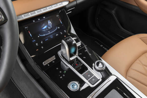 А как раз затем, чтобы создать у владельцев ощущение «у меня так же» — другого объяснения быть не может. Ведь есть немало китайских машин с самобытным дизайном салона при достойной эргономике — та же Geely Tugella. Но если не зацикливаться на заимствованиях, то смотрится интерьер здорово. Приятная цветовая гамма, плавные линии, качественные дисплеи, стильная подсветка — не только контурная, но и оригинальное сияние внутри корпуса джойстика. Кстати, справа от него на тоннеле едва заметно проглядывают иероглифы, подсветка которых отключена в рамках русификации (весьма достойной). А сам тоннель покрыт тёмным глянцем, отчаянно собирающим на себе пыль, царапины и отпечатки.