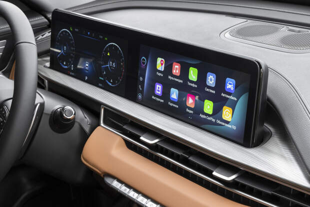Мультимедийная система демонстрирует хорошее быстродействие и в части домашнего экрана с плитками срисована с BMW, а в остальном интерфейс заимствован у «айфонов». И последнее обстоятельство заставляет путаться, если пользоваться подключением к системе мобильника — из-за похожести иконок с эппловскими сложно понять, находишься ты в меню мульдимедийки или уже внутри «карплея». На большом центральном экране (диагональю 12,3 дюйма, как и приборка) особенно впечатляет картинка с внешних камер и встроенная в неё трёхмерная модель автомобиля — в ней даже реализованы динамические поворотники!