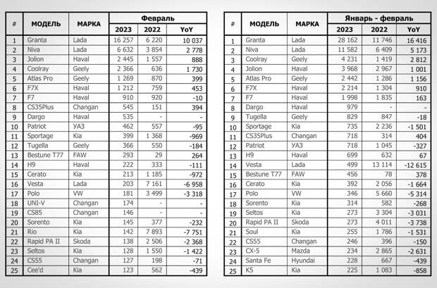 Заканчиваются автомобили и в салонах других европейских и японских марок. Так, Suzuki, которая, в отличие от прочих, продолжает работу в стране, реализовала в феврале 2023 года 17 машин против 447 штук в том же месяце 2022-го.Если говорить о рейтинге бестселлеров среди моделей, то в лидерах по-прежнему отечественные и китайские автомобили. На первом месте Lada Granta, на втором – Lada Niva, третья и четвертая строчки достались Haval Jolion и Geely Coolray соответственно, а замыкает первую пятерку Geely Atlas Pro.
