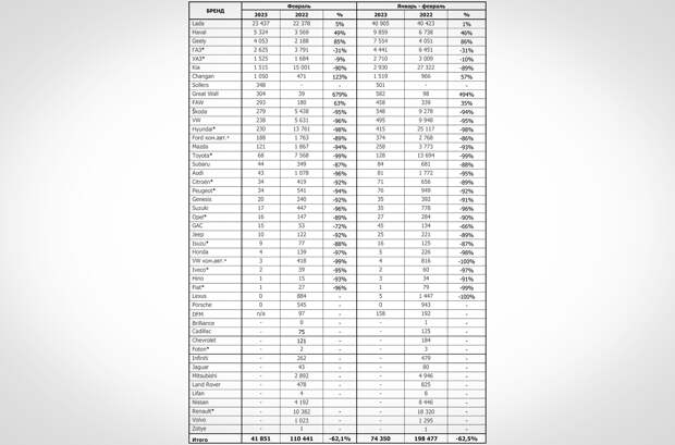 Согласно официальной статистике продаж, которую публикует Ассоциация европейского бизнеса, в феврале 2023 года российский первичный авторынок сократился на 62,1 процента, до 41 851 единицы. Последний раз положительная динамика была зафиксирована в июне 2021 года – с тех пор продажи не выходили в плюс ни разу.