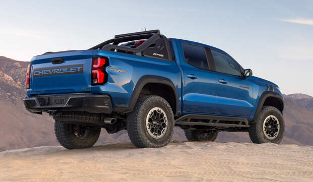 А на вершине гаммы — версия Colorado ZR2, которая была и у прежней модели. Ее основная особенность — подвеска с усиленными рычагами и амортизаторами Multimatic DSSV, которые имеют три камеры с раздельными клапанами, вынесенные за пределы корпуса. Дорожный просвет увеличен до 272 мм, установлены шины внешним диаметром 33 дюйма и дополнительная защита снизу. Угол въезда — внушительные 38,3 градуса против 29,1 у модификации Z71. Но и это еще не все: за доплату предложен пакет Desert Boss, который включает усеченный передний бампер, колеса с бедлоками, дугу за кабиной, дополнительные прожекторы и фронтальную камеру с режимом «вид под днищем».