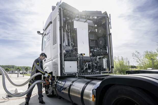 А вот новой разработке компании Daimler Truck эта заправка точно не подойдет. Ведь один из прототипов грядущего водородного тягача компании Mercedes GenH2 Truck питается уже не сжатым, а сжиженным водородом. На этой машине установлены два бака, каждый из которых вмещает по 40 кг водорода, который содержится в жидком состоянии при температуре минус 253 градуса по Цельсию. Заявляется, что использование подобного топлива связано с тем, что оно обладает куда большей плотностью энергии — а это позитивно влияет на итоговый запас хода на одной заправке. Цель всех экспериментов Даймлера — достигнуть 1000 км «беспосадочного пробега».